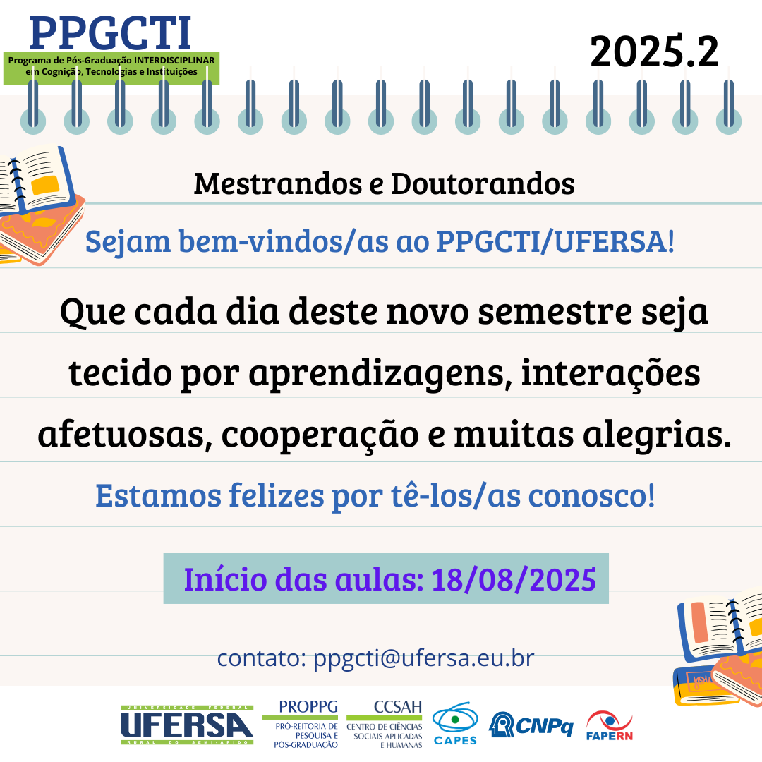 - V Seminário Interdisciplinar em Cognição, Tecnologias e Instituições traz à Mossoró RN a reflexão sobre – Cognição, Afeto eTecnologias: enfrentando o caos Civilizatório – Mais Informações em: https://ppgcti2023.ufersa.com.br/